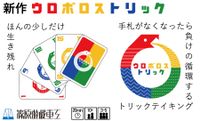 3. ウロボロストリック (“Ouroboros Trick”) — In this trick-taking game, when you run out of cards in your hand, you reshuffle the cards that you’ve won and use them as your new hand, but first you discard one or more cards based on the smallest card that you won. When someone needs to refill their hand but can’t, the game ends and that person loses. (¥2500)