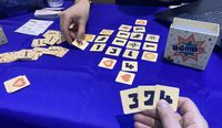 In this 2-5 player game, you’re trying to be the first to have five trophies showing in the grid. You have three tiles in hand numbered 1-4, and on a turn you place a tile face up adjacent to at least one other tile with the restriction that a line of adjacent tiles can’t sum to more than 5 — and when they sum exactly 5, you place one of your trophies at the end of the line. If the other end is empty, you place a random bomb tile at that end.