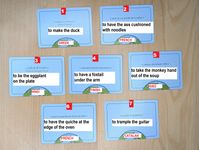 Although I must say, the design doesn’t feel trivia-like in any way. Now it works like this: Seven cards are on the table, with the literal translation face up. Someone shuffles the cards secretly, reads the real meaning of one of those cards, then shuffles them and again places them literal translation face up. The players discuss which idiom has the spoken meaning, then flips a card over. If they’re wrong, they keep discussing, then flip another card, then another… If they’re right, they fill the table to seven cards, then start a new round. After ten cards have been flipped, the game ends.