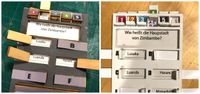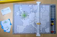 I made a prototype with a map of Germany and questions asking where to find place names (cities and landmarks) or photos. Players placed plastic rings of three different sizes, and the smallest ring that included the correct answer got points. How to show the solution was basic: I laid a grid over the map and printed the solution on the back of the question card. That was simple, but not fun; I’m sure today I would come up with something more clever, and in fact later during the development Arno and I did find something — but how did Arno come into the equation?