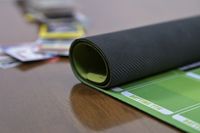 It looked great, but immediately Garrett knew CARDBOARD was not what his game wanted to be – though he did not play Pokemon, his friends did and they had a playmat for their cards. The cards would not slide, the surface made it easier to pick them up, and most importantly a playmat went where the cards went (in a backpack, folded into a binder, etc.). In feel, BCGM wanted to be more like a TCG and that meant a NEOPRENE surface. It also meant we could avoid many of the things I (as a parent, not yet a board game publisher) really struggled with for games in our home – bulky boxes that take up room and get destroyed, excessive pieces that get lost, instructions that get torn or frankly largely ignored. OUR USE CASE was keep everything (ie all mechanics, all rules, etc.) on one playmat so that it could go to a school, youth baseball tournament, friend’s house, or restaurant/bar with no box/pieces/instructions needed.