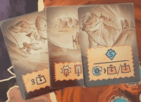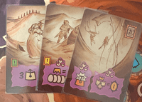 4. Banner cards. Each Colossus has a set of six unique banner cards. During set-up, you randomly select a number equal to the player count and remove the rest. When a player reaches the top of a Colossus city, they look at the available banner cards and choose one to keep. A banner card grants a powerful one-shot action. Once used, it is flipped face down, but when that player reaches the top space again, they not only choose another banner card, they also refresh all their previously used ones — creating a mini-engine of recurring, powerful benefits.