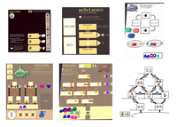 Chronological iterations of the action system, often featuring a player board or a hand of cards — until the final version, which required neither