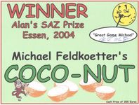 A small but fine coincidence came to my aid in finding a publisher. In 2004, there was an area at the SPIEL in Essen where game designers could show their prototypes. This was organized by the SAZ (Spieleautorenzunft = Game Designer Association), whose chairman at the time was Alan Moon. He had won the “Spiel des Jahres” award in Germany this year with “Zug um Zug” (“Ticket to Ride”). He donated a sum of money and awarded the SAZ Prize for what he considered to be the best game among the prototypes presented. He chose COCO-NUT.
