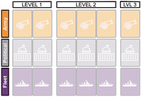 You develop your land and sea power with armies and fleets.