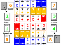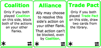 Umm, how do you create a two-player game based on negotiation? The two-player variant for the original turns the game into a bidding game where players bid to create their initial positions on the map. One thing I decided from the start was that I wanted to find a way to make the two-player experience resemble the 3+ player experience as much as possible. Since negotiation was out, how do I create the same tension with only one neighbor? Additionally, I’d lost the ability to have players have different access to actions on the left versus the right since you have only one opponent. I decided that what if, instead of a single “conflict” being resolved on each side, players now had to fight two battles on each front? What action is on what side, and the order they resolve in, could create a space for a lot of mind games and second guessing. I had an initial version by December, but was still making tweaks. The big question was whether players were forced to commit each action to a single battle, or were they allowed to respond with either action in response or something else. I tried different versions of these, but they felt too complicated or too obvious. I finally settled on a system where each player had to commit to a vanguard action on their left, and they then “attack” either action their opponent had on this side. This added more bluffing and limited the complete control players had before. Below is the final version: