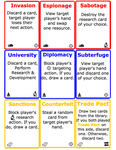 Another card that changed during this time, as a version of Trade Pact moved out of financial and into the backstabbing set, was that I added a new card called Resupply to the financial set. Despite a card game already implying the importance of hand management, lots of players were being overzealous with University (Proliferation in the final version) and ending up card-locked. While Resupply only draws you one card, it also can never be blocked, so it can be a good choice if you think this opponent might try to play a blocking card this turn. It also lets you start rebuilding your hand.
