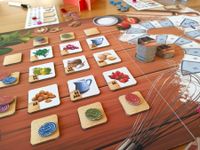 The basic idea is that each player receives a part of the recipe from grandma. In practice, it’s four ingredients, drawn randomly. On their turn, the players give clues about their ingredients using the central grid on the game board and clue tokens. On other players’ turns, they decipher clues from the other players.