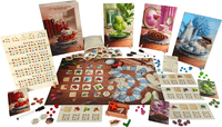 Overview of the components. Each player receives a recipe board with four hidden ingredients, a player board on a stand to track the clues, and a discussion card used to make guesses. The central board features the score track and the pantry grid where players give clues.