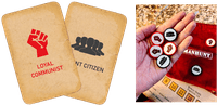 To model the attitudes of the local population, I initially created a Manhunt Deck filled with Loyal Communist and Silent Citizen cards. Each time the Fugitive entered a town, a card was drawn. Silent Citizens kept quiet while Loyal Communists immediately reported the Fugitive’s position. The Fugitive’s decisions influenced the deck’s makeup: heroic behavior added Silent Citizens, while killing and pillaging produced enthusiastic informants. Government actions, such as interrogations or propaganda campaigns, could also shift the balance. Eventually, I replaced the deck with a draw bag, which proved far more practical than reshuffling a deck many times per game.