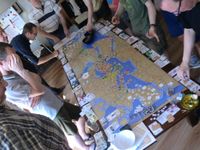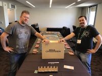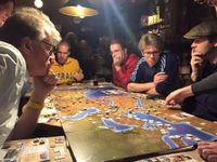 While talking to Michael Bruinsma, CEO of Dutch publisher 999 Games, he suggested combining both games into a limited edition collectors item: Mega Civilization. Finally, no sooner than 2015, the game was published: a heavy wooden box of 11 kg (25 lbs), a game that supports 5-18 players and takes thirteen hours to play. It sold out in a few months.