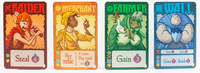 Similarly, starting Raiders steal 4, market Raiders steal 5 + an ability, and some Raiders steal a whopping 6, but with a weakness, such as the Cutpurse who steals 6…but is stolen from when she goes up against an enemy Raider. The Berserker steals 6, but is stolen from when she goes up against a Wall. The Outlaw steals 5 and gets a free card if it faces a Merchant.