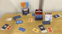 Each player has two ME cards, two YOU cards, one ME ME ME card, and one YOU YOU YOU card. In a round, one player draws a question card, then reads one of the two questions on it, such as “Who has the most friends that they used to work with?”