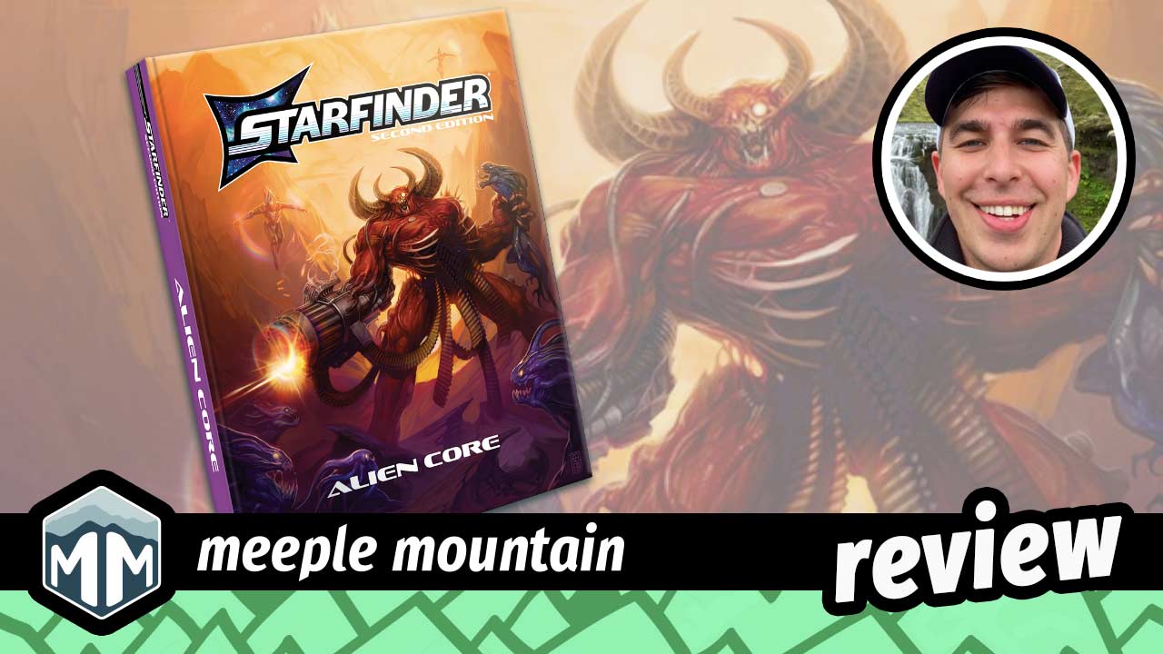 If you're a Gamemaster running Starfinder Second Edition, the Starfinder Alien Core is your de facto manual of monsters. It promises pages upon pages of strange creatures that would feel at home in any sci-fi world. Some are geared more towards horror, others are more techy, and some are there as classics to hit you with a nostalgia bomb. Let's take some time to run through the highlights of the book. Starfinder Alien Core Right off the jump you are greeted with the full alphabetized table of contents for every creature featured in Starfinder Alien Core, including visual breaks for each set of letters to prevent the usual wall-of-text layout. Directly afterward is a brief section that describes the different aspects of a creature's statblock, how to play creatures, and making adjustments. I was quite surprised looking back at the Starfinder GM Core that this information was never included. There is more in-depth guidance into custom creature creation, but nothing that lays out the aspects of the statblock as succinctly as this. Then it's time to dive right into the 200 pages of creatures, typically featuring one on each page. The general flow of information starts with a brief snippet of lore about the creature to set the scene, followed by the creature's statblock. The sidebar also always features… The post Starfinder Alien Core Review appeared first on Meeple Mountain.
