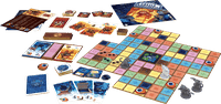 Two players face off in Castle Nightingale, with the ninja player trying to steal five relics before the samurai player can capture the three ninja thieves. The castle is comprised of an inaccessible garden surrounded by four double-sided floor boards, each showing two secret passage spaces and areas in five colors.